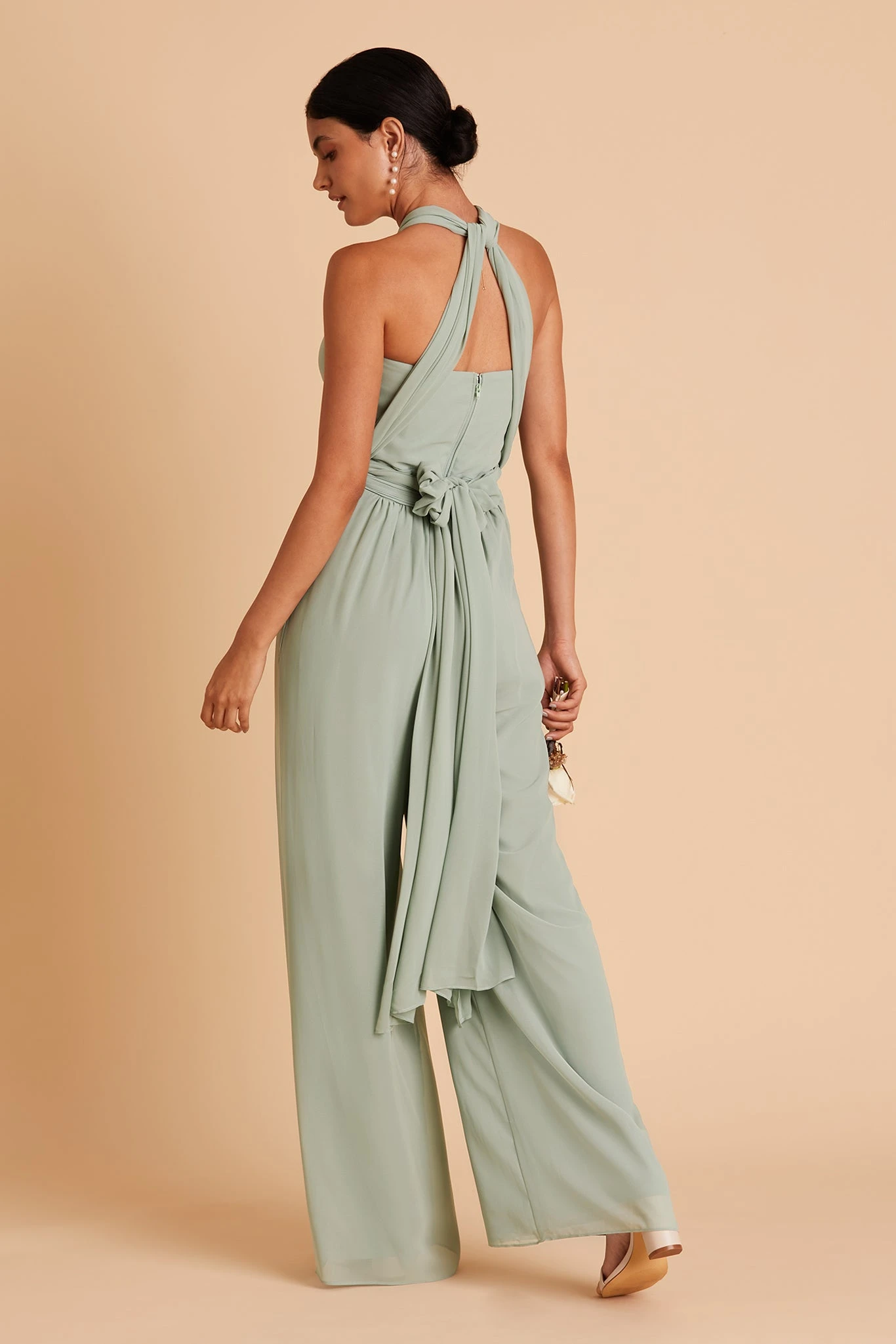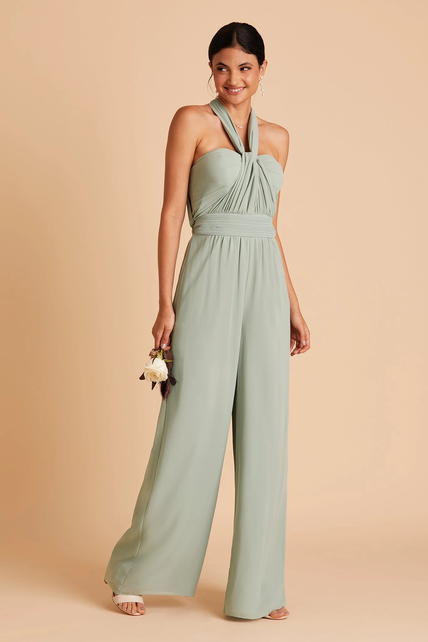 On top, Gigi is reminiscent of our Grace Convertible Dress. She has a pleated sweetheart bodice and two extra-long streamers that allow you to create a near-endless number of necklines. Gigi has bra cups for extra support and hidden pockets, so you’re never too far from your lip gloss. Just a note, the spaghetti straps are super long, so you might want to alter them, depending on which way you decide to arrange the top. On the bottom, she’s got PANTS! Gigi is our very first bridesmaid jumpsuit and needless to say, we’re so in love.