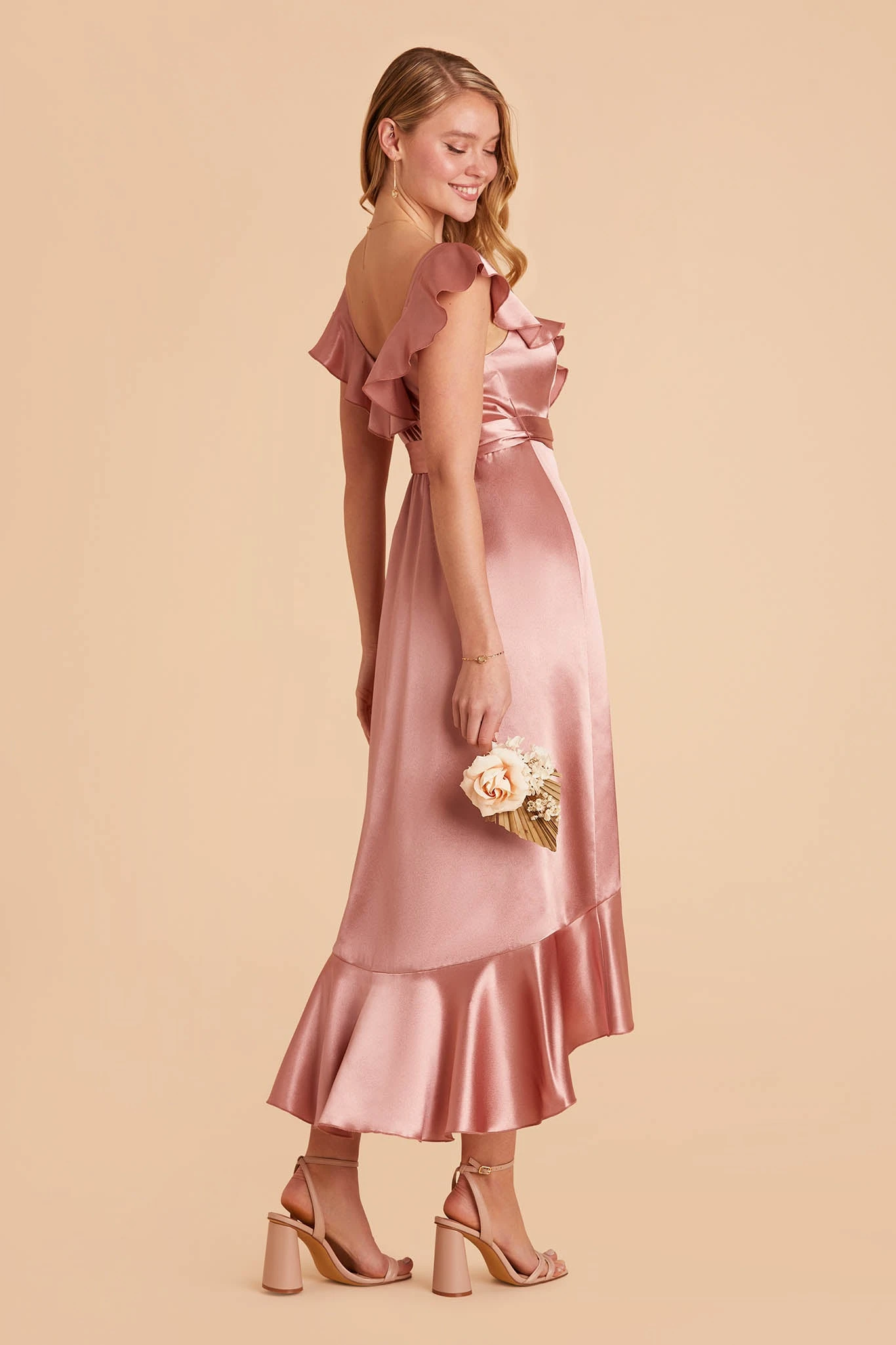 This satin midi bridesmaid dress, with its asymmetrical skirt and cascading ruffles is as romantic as it gets.