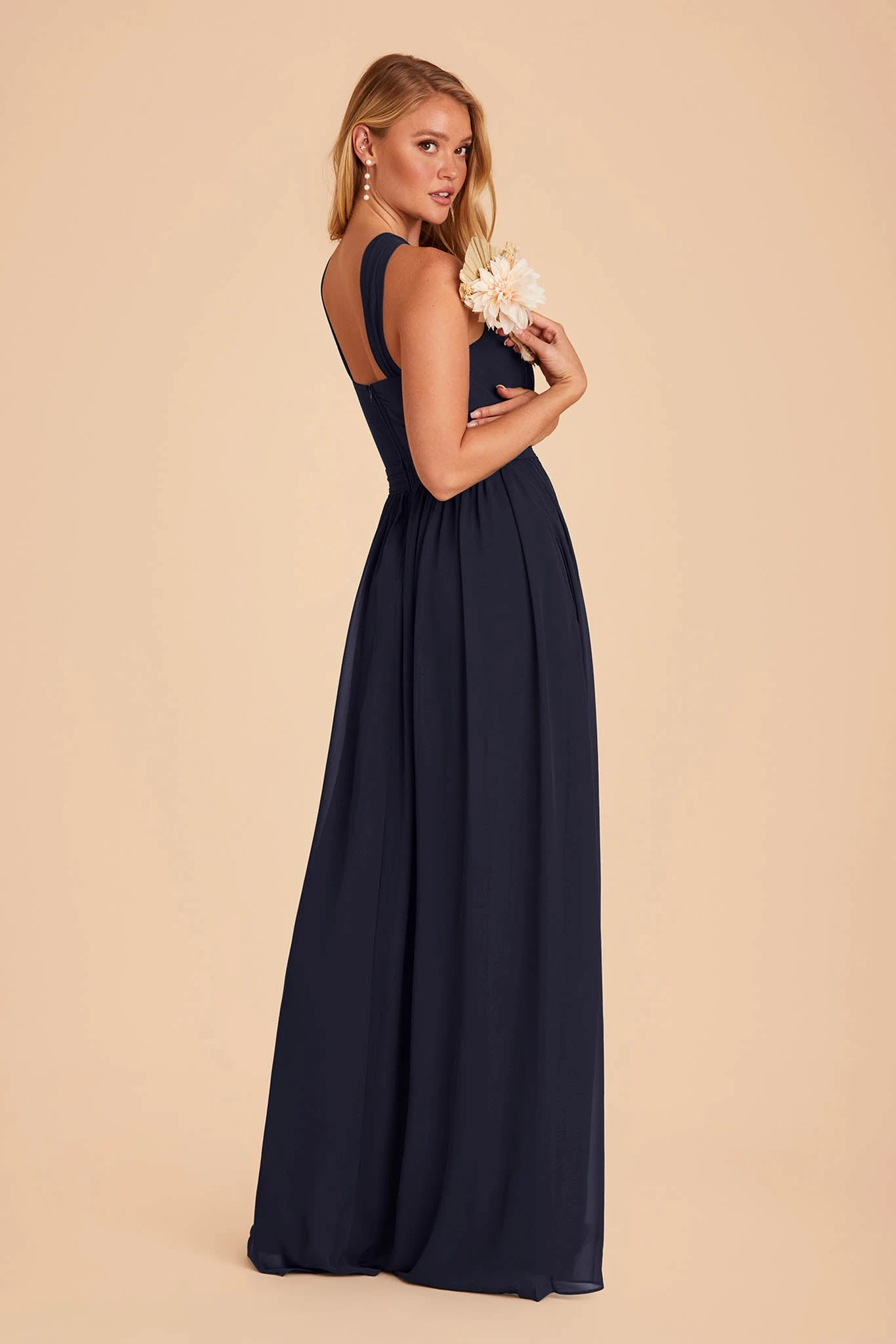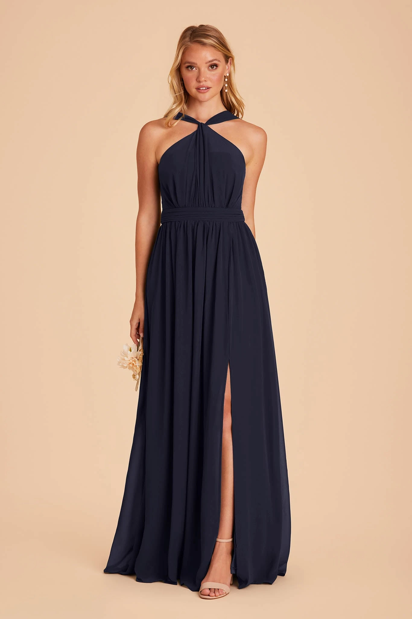 What does every goddess need in order to complete her sleek bridesmaid look? Secret side pockets for stashing her iPhone! This design features a gently ruched high-neck halter silhouette and a sexy slit in the skirt. Kiko in airy chiffon also has built-in bra cups and fits true-to-size.