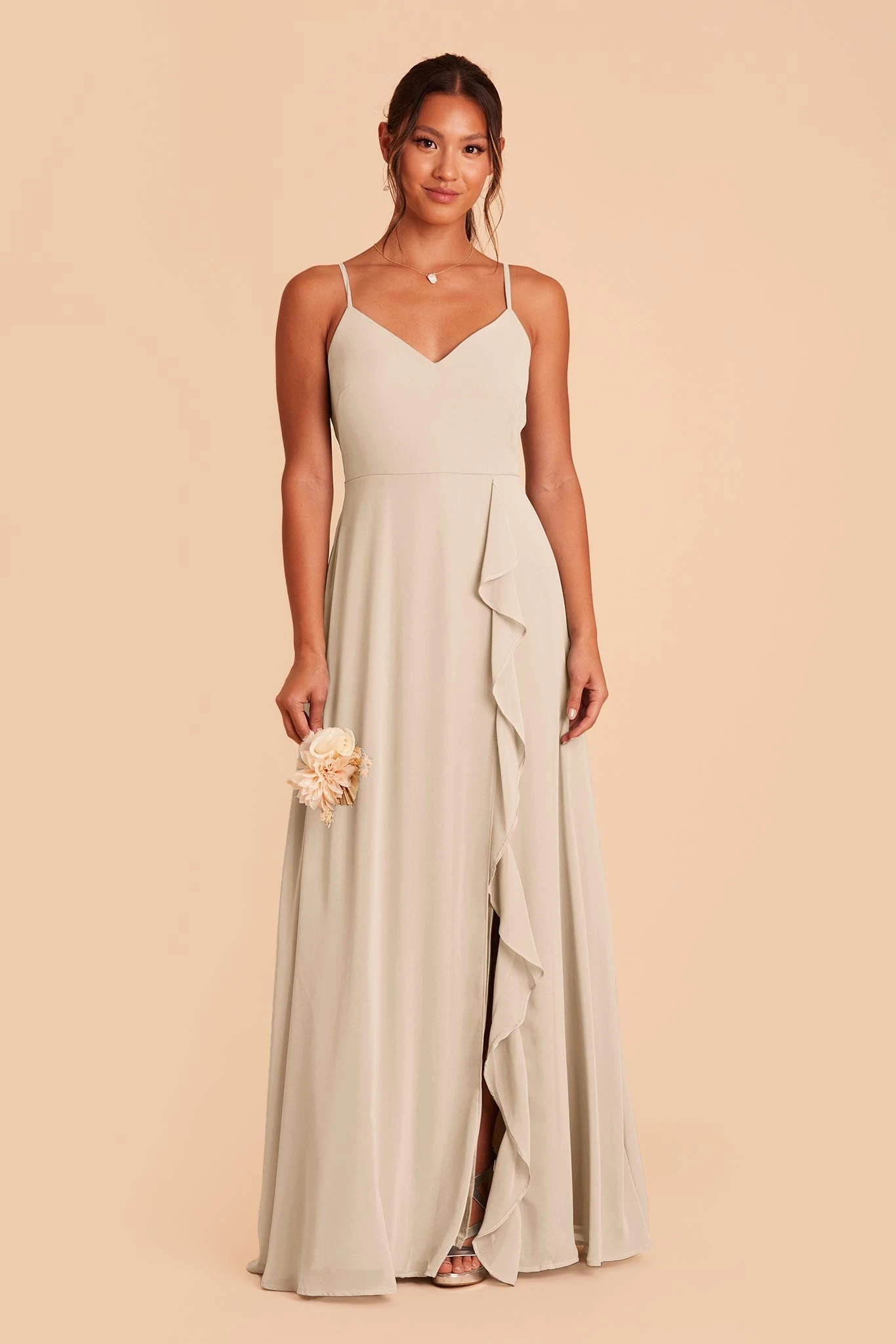 Timeless style, meet ultimate breathtaking details. We think you’ll be the perfect match. The downright class of this understated, super flattering bodice paired with a chiffon ruffle cascading down the leg slit gives a waterfall effect while you strut down that aisle. You still get all the side-slit sass, just elegantly softened with a feminine ruffle. Talk about the best of both worlds. Plus, the adjustable spaghetti straps with two ways to wear give you all the comfy options to make sure you’re dancefloor-ready all night long.